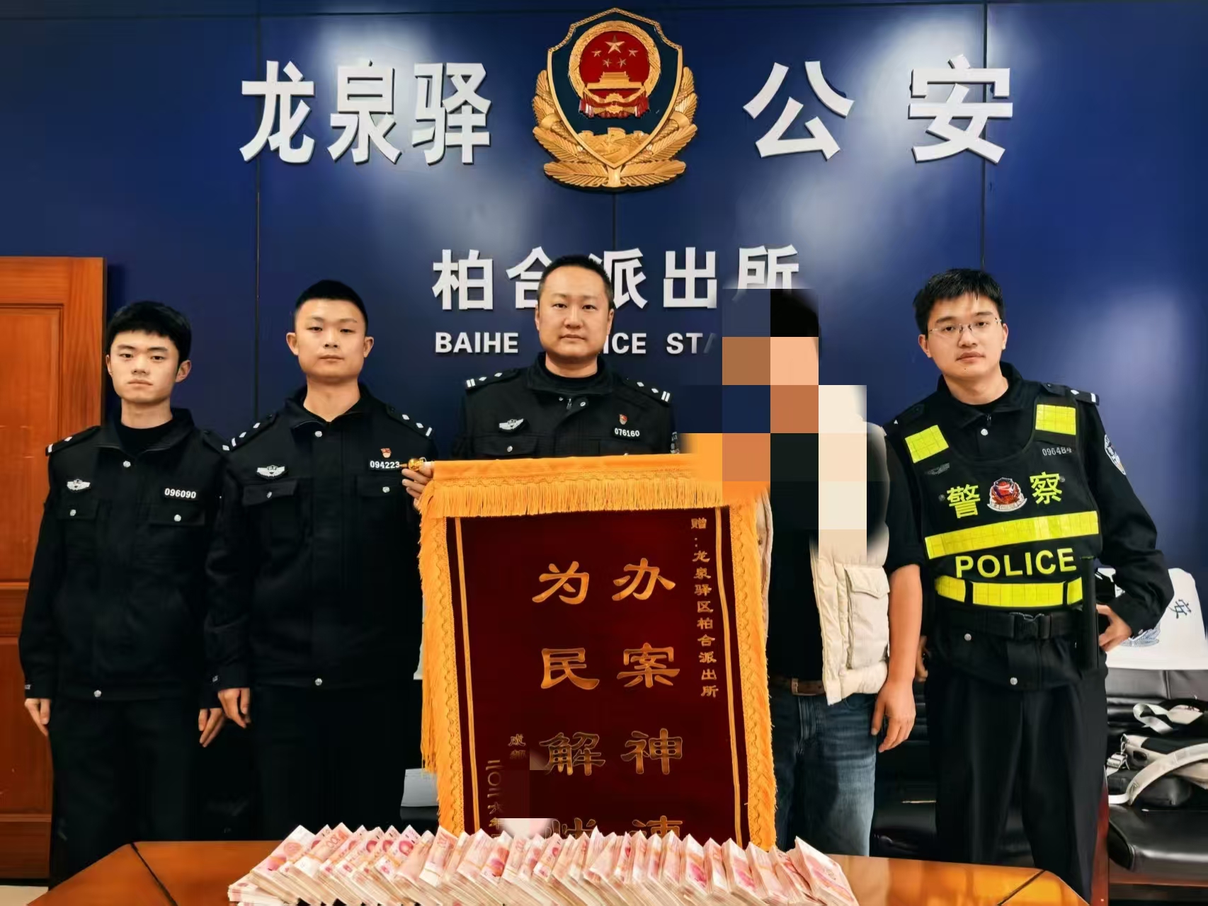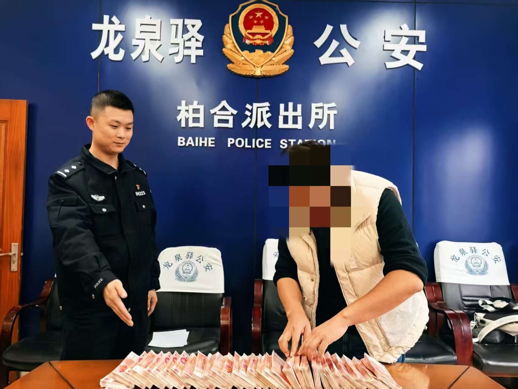 近日,成都市公安局龙泉驿区分局柏合派出所在开展侦查工作时,抓获“取钱手”周某,现场挡获现金30万元。经核查,该笔现金为受害人余先生的被诈骗款项。掌握到相关信息后,民警立马通知余先生到所上。