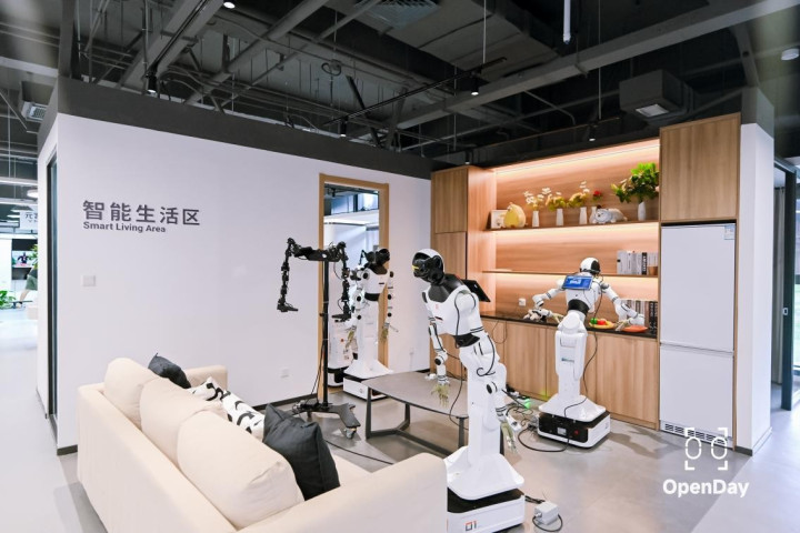 其中智能生活区还原真实家居场景,包括客厅、卧室、卫生间、厨房等核心空间,可以实现机器人开关冰箱门、叠衣服、清洁卫生间等任务。工业场景模拟工厂流水线,可以实现物料分拣、包装打包、物流搬运等。能够真正做到数据采集并非在理想的“实验室温室”中进行,而是直面现实世界的复杂性与多样性,能够有效保证数据集的高保真度、强实用性及卓越的泛化能力。