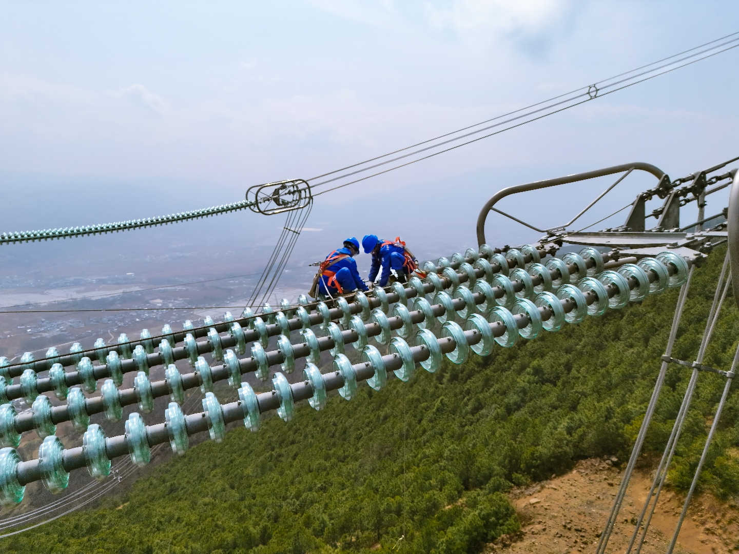 国网四川超高压公司检修人员正在为白鹤滩—江苏±800千伏特高压工程输电线路更换自爆绝缘子。(罗伍达 摄)
