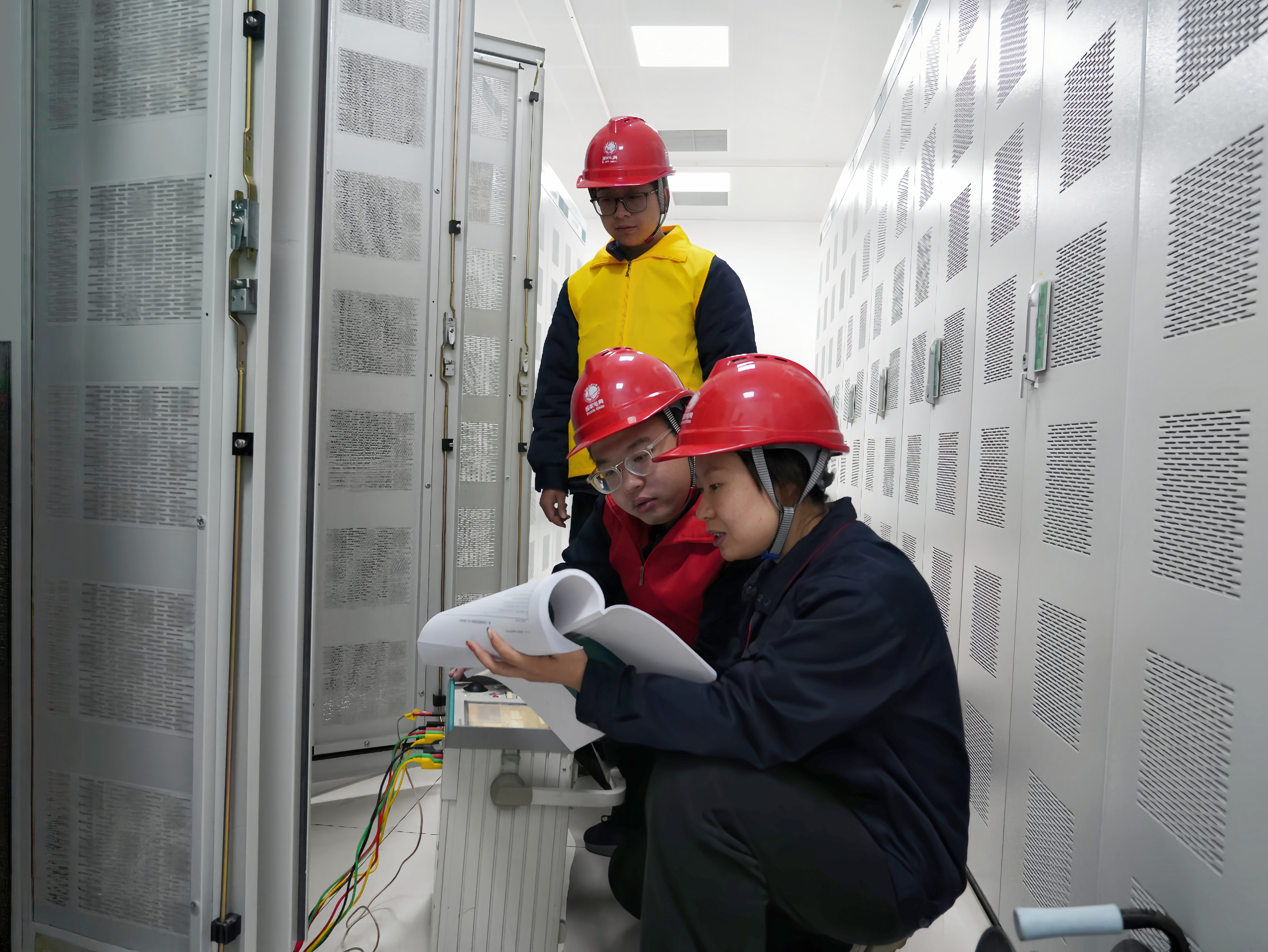 国网四川送变电公司检修人员在±800千伏金沙江换流站换流变区域极Ⅰ高端阀组测量接口柜经装置采样。(王娇 摄)